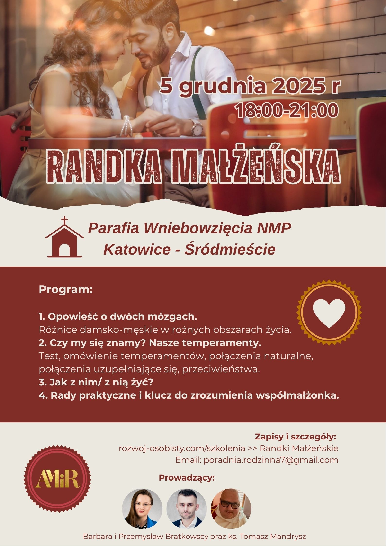 Z myślą o małżonkach i wszystkich zakochanych już od grudnia 2025 rusza cykl spotkań „Randki Małżeńskie” w Parafii Wniebowzięcia NMP w Katowicach. Czas wyjątkowych wieczorów dla dwojga (1x w miesiącu), poprzedzonych krótkimi warsztatami rozwojowymi. To czas, w którym uczestnicy nie tylko nauczą się rozmawiać językiem serca, ale przede wszystkim naprawdę się usłyszą.